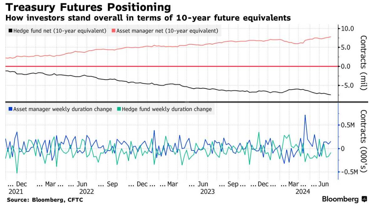 根据美国商品期货交易委员会(cftc)的数据,在截至7月2日的一周内,实体货币账户增加了15.6万个10年期美国国债期货等价物,继续建立期货净久期多头头寸。对冲基金扩大了约8.7万份10年期国债期货的净空头头寸。本周资产管理公司净仓位增加最多的是 10 年期和超 10 年期国债期货,风险合计为 1070 万美元/DV01。