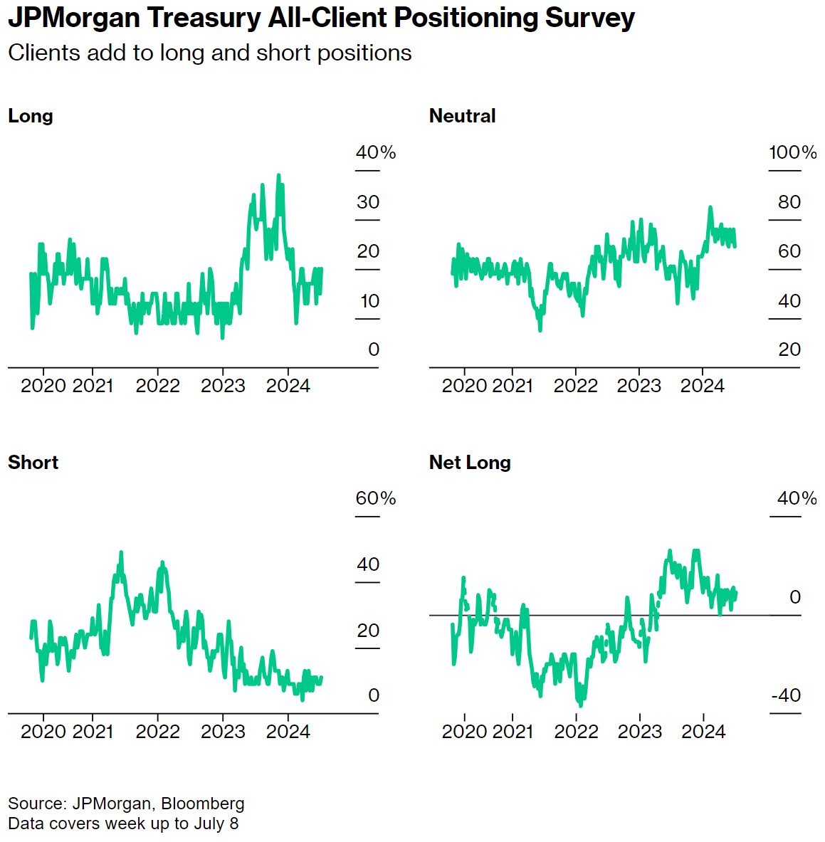 在截至7月8日的一周内,摩根大通客户的直接多头头寸增加了5个百分点,达到两周以来的最高水平。同期,完全空头也增加了2个百分点。目前,空头头寸达到6月10日以来的最高水平。