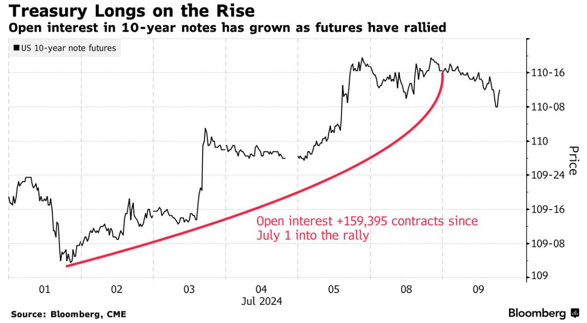 本月迄今为止,10年期美债期货的未平仓合约逐日增加,总计约15.9万份合约。9月期10年期国债期货的未平仓合约已升至近450万份,为当前合约周期中最多的。
