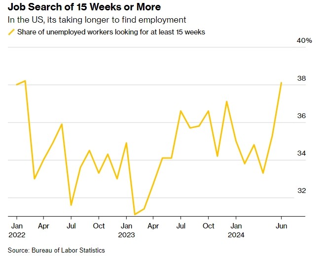一些经济学家警告说,劳动力市场可能正在放缓,情况可能会恶化。6月,找工作超过15周的人数上升到自2022年初以来的最高水平。