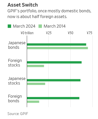 日元的大幅贬值,也已导致日本政府在过去一年的时间里多次出手干预——抛售美元以支持日元汇率。而在此背景下,同属于日本政府旗下的部门,养老金投资基金若还根据原先的策略大量投资美国资产,其实反而在“拖后腿”——进一步按下美元兑日元升值的加速键。