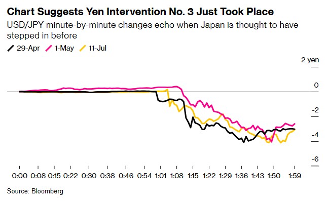 周四的飙升与今年之前的干预有相似之处,当时日本财务省在4月29日和5月1日买入了9.8万亿日元,以遏制明显的波动。日元周四创下5月1日以来最大单日涨幅。