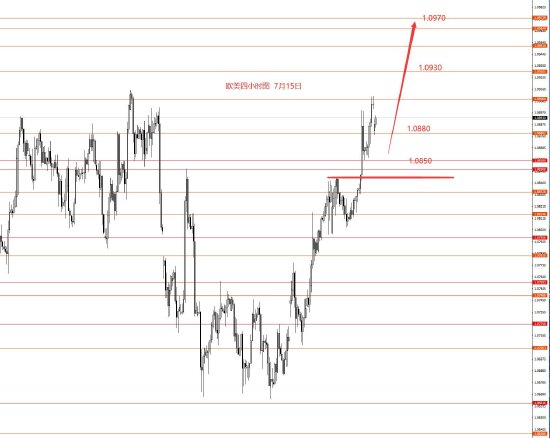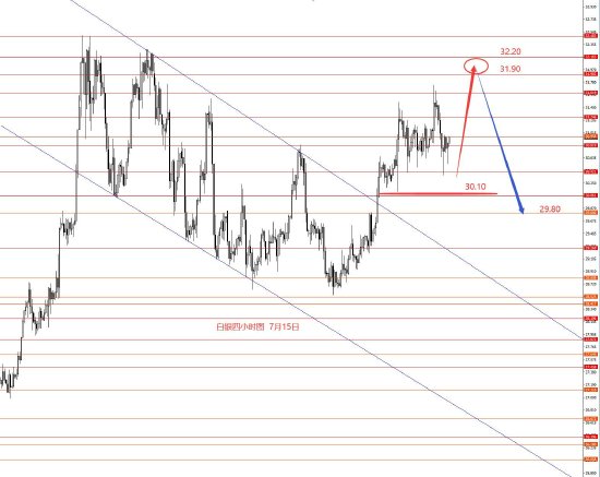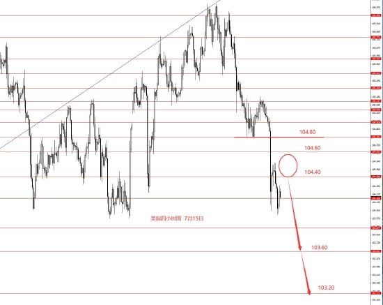 7月15日,上周美指正如预期向下运行,最低104.00区域周图收阴柱。从图形来看,目前图形仍然看跌,延用前期框架思路,本周上方关注104.80强阻力,以下继续看空,下方关注103.60和103.20区域,留意本周探底反弹行情。本周操作建议:104.40-104.60区域做空,止损105.20,目标看向103.60和103.20,波段下方强支撑102.80和101.70,本月不一定能到。控制仓量,严格止损。