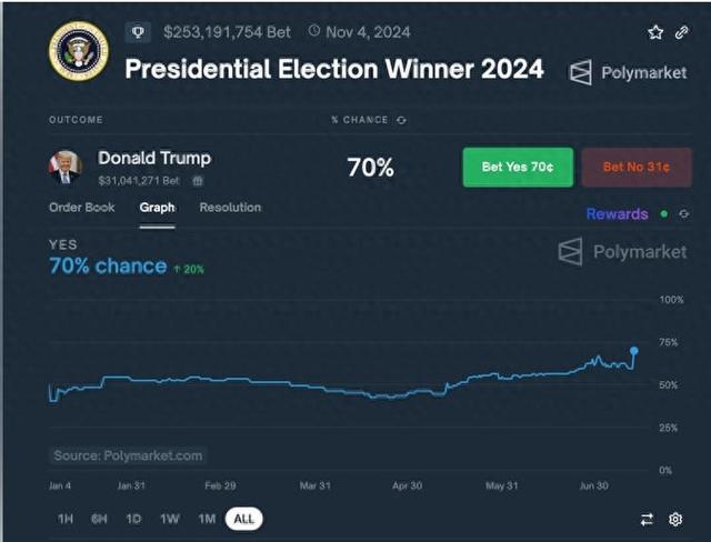 据市场预测平台Polymarket的交易员称,事件发生后,Polymarket上关于特朗普是否会赢得总统的合同中“是”的押注上涨了10美分,达到70美分,这意味着投资者现在认为特朗普在11月获胜的可能性为70%。Polymarket上的投资者赌注背后是区块链,最终结算可采用美元,也可用加密货币。仅以法定货币结算的更传统的博彩网站PredictIt也显示出类似的趋势,特朗普的押注从枪击前的59美分攀升至66美分,随后稳定在65美分。