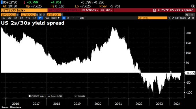 他预计,两年期美债与30年期国债之间的利差将从当前这里开始果断转正,并最终扩大200个基点之多。