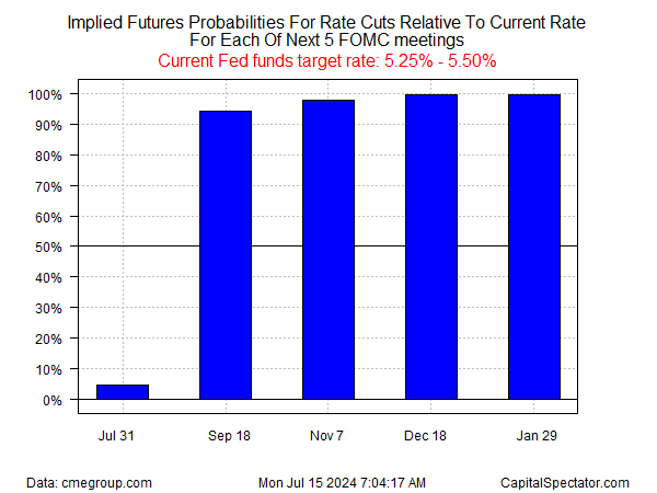 联邦基金期货目前的定价显示,美联储很有可能(90%以上)在9月18日的FOMC政策会议上开始降息。这比7月3日估计的大约65%的可能性大幅上升。(与此同时,预计7月31日的下次会议不会降息。)