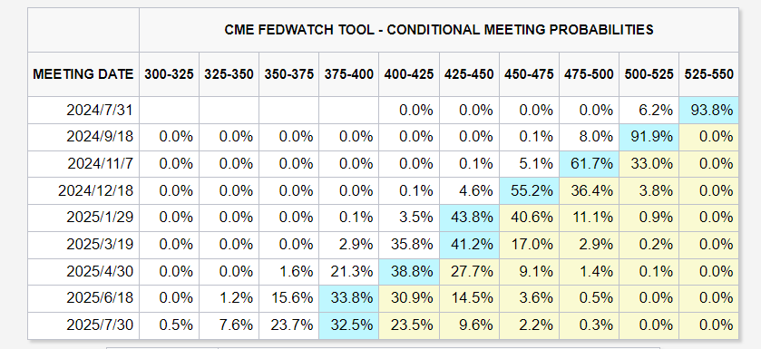 不过根据CME美联储观察工具的数据,市场仍普遍预计“首降”会发生在9月份,可能性高达91.9%,而7月份大概率仍是按兵不动。