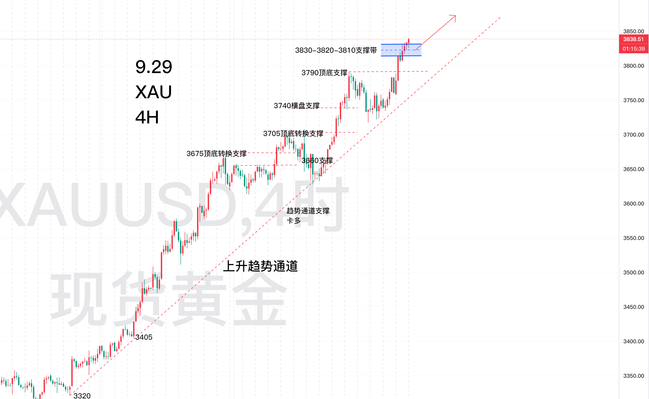综合起来:今日短线上继续顺势原则为主!参考位置:3830附近横盘支撑,3825-3820横盘支撑,其次是3810支撑,3800-3790的支撑;目标位置3875附近的位置;