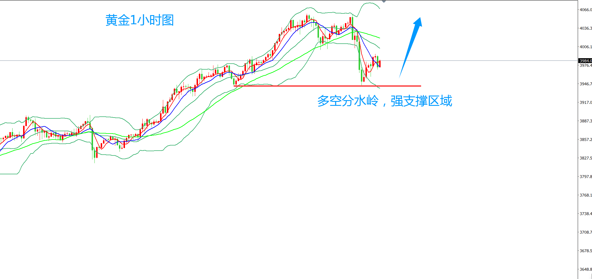 今天,是个过度的时间点,前天高点4058,在昨天二次冲击之后未能突破展开下跌,昨天暴跌100美金,今天是否续跌是调整是否延续的关键,若续跌跌破新低,才能视为4058就是短期顶,调整加深,若今天不能跌破新低,不续跌,则意味着昨天的杀跌就是短线修正,3947就是低点,接下来还会继续上涨。所以,昨天是由强转弱,那今天就要关注能否由弱转强,而关键点就在于是否延续跌势,破位新低。今天是个过度,可以多观察,不建议追空,但同时,做多需等到美盘时段,或者等待二次下探不破新低收出1小时级别的多头信号之后再考虑进场做多,若直接续跌并跌破3947,就放弃做多思路。