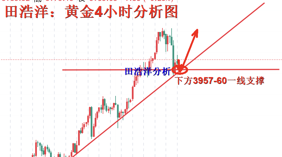 从4小时行情走势来看,下方关注重要支撑3957-3960一线,多头强势上涨不言顶,操作上以回踩做多为主,中间位置一律多看少动谨慎追单,耐心等待关键点位进场。具体操作策略我会在盘中提示,及时关注。