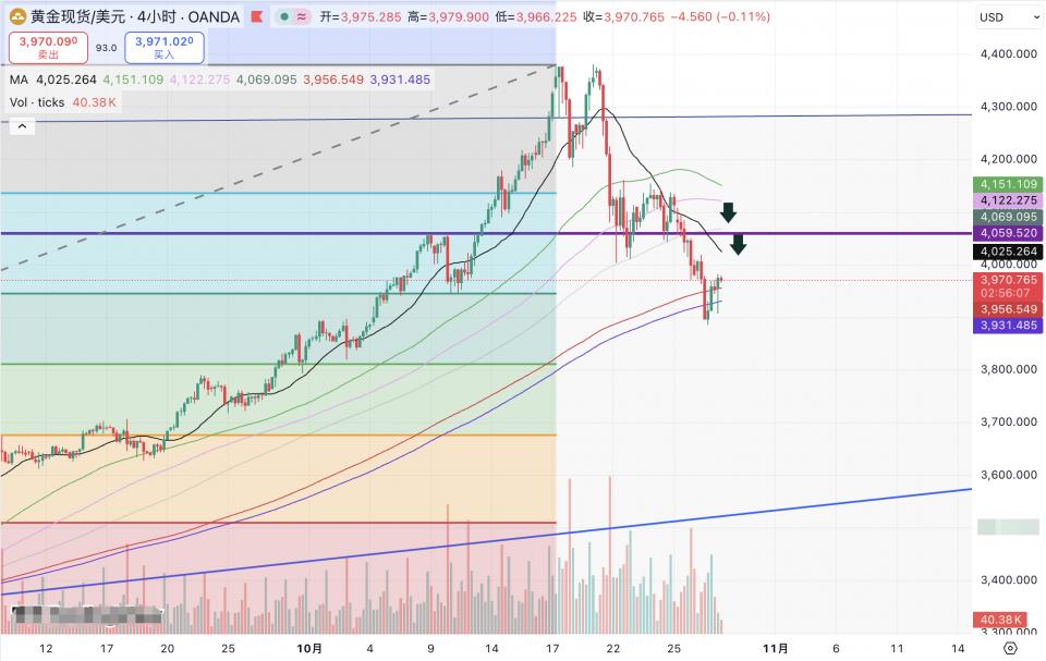 金价于周二晚间突破了小级别下行通道,站上3950意味着短期行情走入反弹,行情之所以能够反弹,得益于183、200日均线的支撑,在4小时级别中,价格完成对这两条均线的空头回补,上方压力位集中在20周期MA的4026附近,从成交量的角度来说,除了昨晚美盘初段的放量外,随后的12小时都在缩量,因此这一波反弹很有可能是诱多,关键在于是否会触及MA20回落还是进一步试探到4050的多空分水岭(上周及本周一都有提及)…
