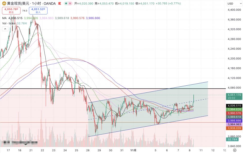今天(11月10日)早上黄金价格快速拉升,价格接连突破4014、4028阻挡,最高触及4051美元/盎司,回调动作到现在还没有出现,有理由相信价格将继续扩张,上方重点关注4060-70压力,且不排除日内重新站上4100的可能性。