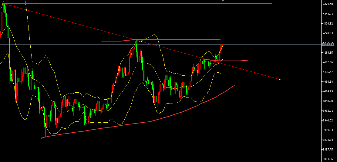 4小时图依托布林道中轨走出一波小回升走高。亚盘留意4250高点附近。此位是此前的摸高点。目前短线虽强,但也只是二次摸高的确认过程。只是短线形态走出逼空慢涨,暂时不好过早开空,进早了容易先扫损后下跌的形态出现,小周期以中轨4180作为临界点,失守此位看空。守住短线先看一波摸高试探。短线多空来回切换。高位慢涨存在反复的冲高回落风险。不可当作单边对待。结合形态盘中灵活应对即可。波动基数大,短线机会较多,把握好切入点。中期波段操作还是等冲高后择机高空,右侧交易结合止涨后找高点切入。以免慢涨逼空过程,进早了先扫损再转换下跌。