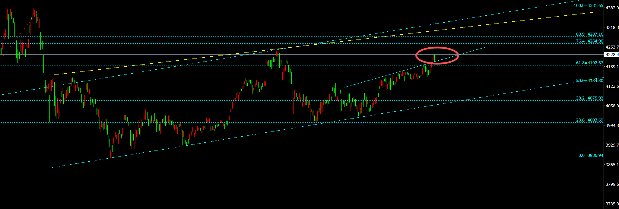回落4208附近多,破底出,跌破反弹15-17短空一次,看4187-92到位再多一次,整体框架就是这样,全天见4287必空位,短线45和65这里配合五分钟信号入场。