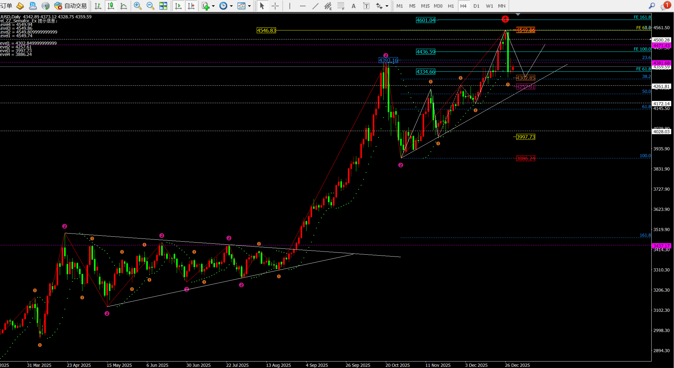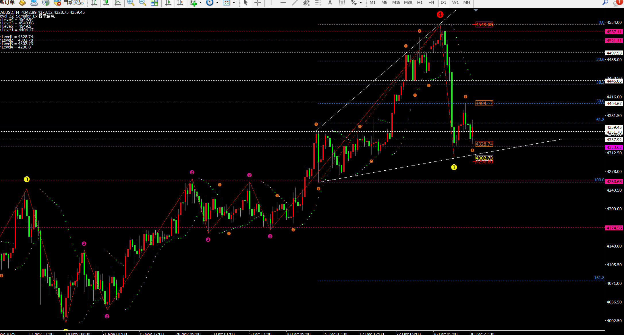 如果目前价格先回落到4350-45区间,那么4380-82空单就取消。直接去4397-4400布局一次空单。二次空在4435-4445两个点。