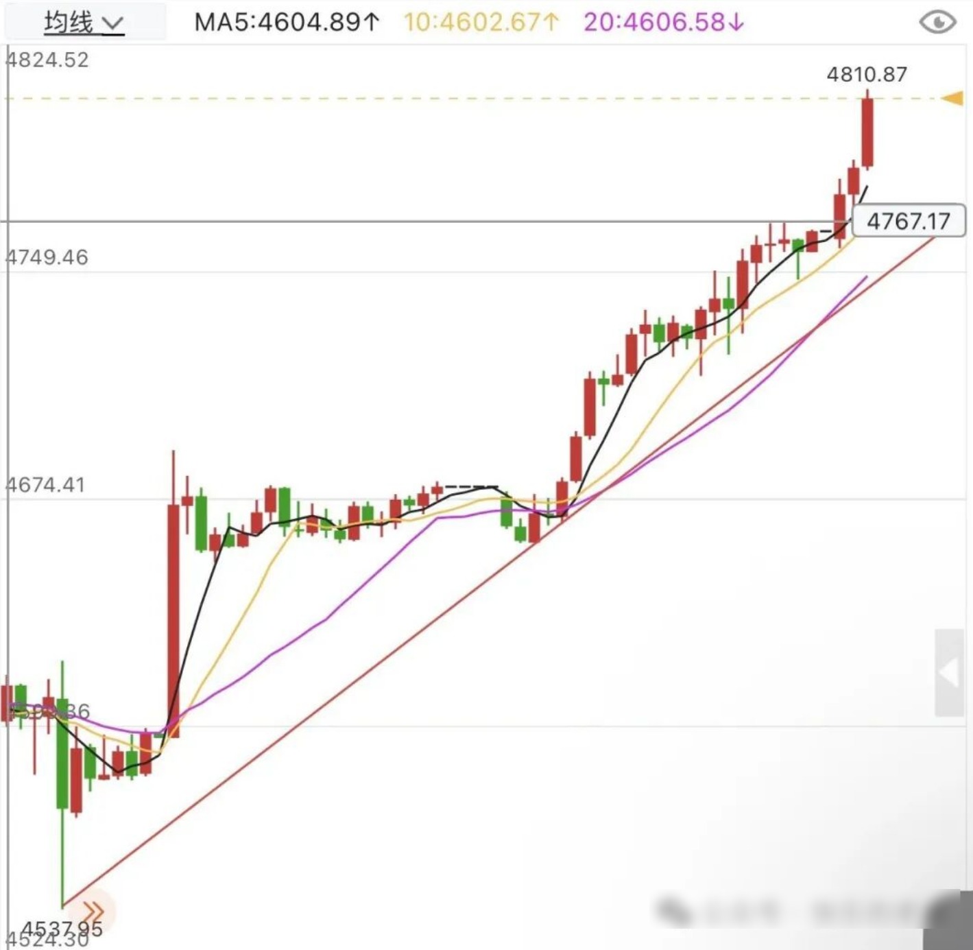 所以日内而言,今天多空强弱分界线4765-70以上保持多头强势,跌落则走弱;然后关注4745-50美元区域,之上保持多头。一旦4745-50美元这里跌破,多头则风险加大,关注走调整,不排除引发止损盘迎来短暂的砸盘跳水。上方的话,拿下4800美元后,第一目标4825-35美元(今天重点),然后4870-65美元和4900美元,是多头目标,当然也是日内阻力。