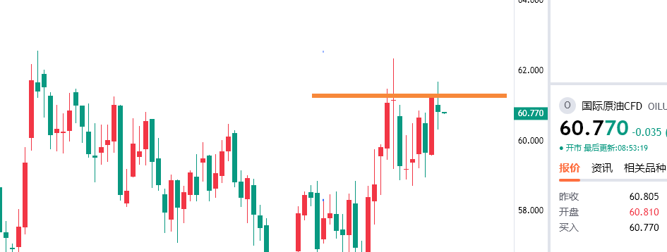 原油继续持仓61.7附近空看59/58一线,空仓的在60.8附近可以继续进场空单!